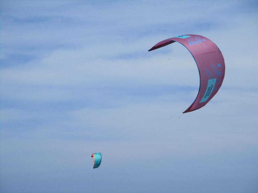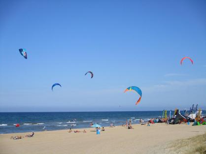 Bonitas cometas de los kitesurfistas coloreando el cielo sobre la playa,