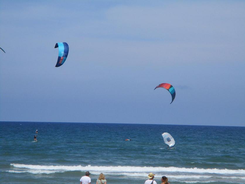 Cometas de los kitesurfistas por la playa,