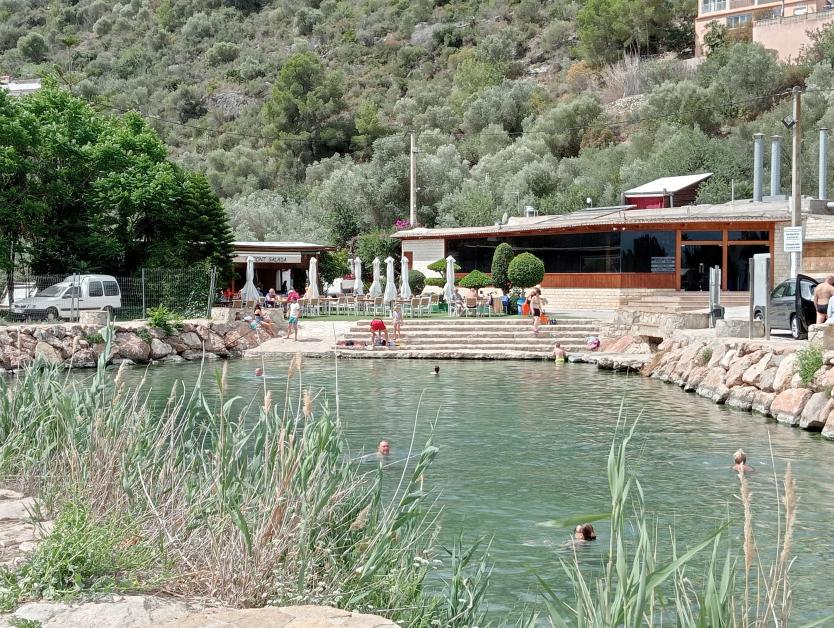 Tras las aguas de la Font Salada a la derecha el restaurante y a la izquierda la cafetería terraza,