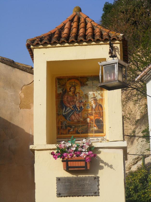 Pequeño nicho católico, con flores, farol y cartel,