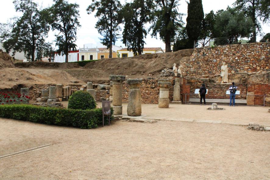 Más allá del postcaenium, igual que en los teatros de Pompeyo y de Ostia, se abre un peristilo, una zona ajardinada para esparcimiento que en origen estaba acotada en sus cuatro lados por una doble columnata formada por columnas de granito basto que estaban embellecidas con un recubrimiento de estuco y pintura. Al fondo de este peristilo cuadrangular, alineado con el eje del teatro y la valva regia, existe una pequeña estancia rectangular en la que se han hallado varias piezas de interés. En principio se interpretó como una biblioteca, pero el descubrimiento de varias estatuas, entre ellas el célebre retrato de Augusto velado como Pontifex Maximus y otro de Tiberio, además de varias inscripciones relacionadas con el culto imperial, llevaron a interpretar que el lugar se destinó a este culto, que después radicaría en el Templo de Diana. Peristilo es la galería de columnas que rodea un edificio, o parte de él; o el recinto rodeado de columnas. Augusto fue el primer emperador romano. Gobernó entre 27 a. C. y 14 d. C., año de su muerte, convirtiéndose así en el emperador romano con el reinado más prolongado de la historia. En la Antigua Roma, el título de pontífice máximo se otorgaba al principal sacerdote del colegio de pontífices y era el cargo más honorable en la religión romana. Inicialmente sólo podían aspirar los patricios, hasta el 254 a. C., cuando un plebeyo logró hacerse con el título. En los inicios de la República Romana el título tenía influencia meramente religiosa, pero fue ganando poder en el ámbito político hasta la época de Augusto, cuando el emperador lo asoció a la dignidad imperial. El último uso conocido del título por parte de un emperador se encuentra en ciertas inscripciones de Graciano el Joven, emperador desde el 375 al 383, aunque éste ya decidió omitir el término de su título imperial. Tiberio Julio César, nacido con el nombre de Tiberio Claudio Nerón, fue emperador del Imperio romano desde el 18 de septiembre del año 14 hasta su muerte, el 16 de marzo del año 37. Fue el segundo emperador de Roma y perteneció a la dinastía Julio-Claudia. Era hijo de Tiberio Claudio Nerón y Livia Drusila, miembro por tanto de la gens Claudia. El denominado Templo de Diana es un templo romano construido en el siglo I d. C. en la ciudad de Augusta Emerita, capital de la provincia romana de Lusitania, actual Mérida (España). Se levantó en el foro municipal de la ciudad romana siguiendo la configuración habitual de los templos de la antigüedad clásica y es el único edificio religioso romano que ha perdurado en Mérida en un aceptable estado de conservación. En realidad estaba dedicado al culto imperial, no a la diosa Diana, y debió ser uno de los templos principales de la urbe, a juzgar por su dedicación y por el lugar preeminente que ocupaba en el espacio urbano. Desde 1993 está declarado Patrimonio de la Humanidad como parte del Conjunto arqueológico de Mérida.