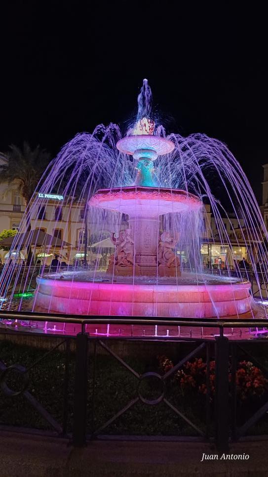Fuente iluminada en la Plaza de España,
