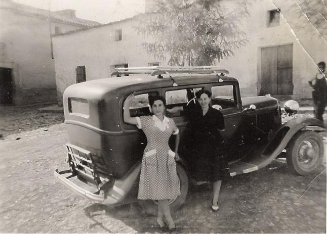 Dos mozas y un coche en la plaza de Extremadura (foto antigua),