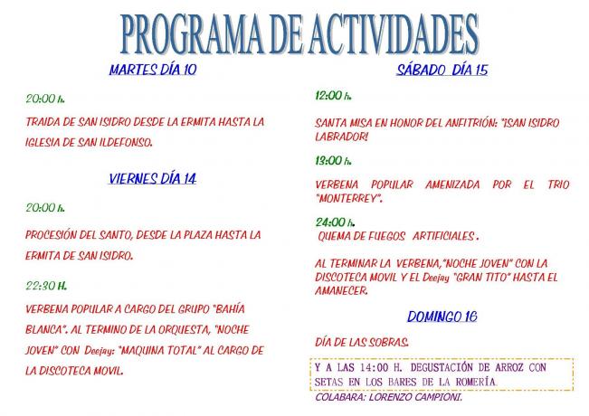 Ahora que pronto se acercan las fiestas de Agosto, ¿porque no se no se hace un concurso de carteles, anúnciandolas? Eso si, los premios que los den los establecimientos Aunque hubiera sido poco algo sería, que no están las cosas para tirar el dinero en tanta fiesta innecesaria. A nivel nacional ya está Zapatero, aunque visto lo visto está más perdido que el barco del arroz. El ahorro, no es para tener más fiestas al año que biene, sino para emplearlo en otras necesidades que tiene el pueblo. Pero ya se sabe al pueblo: pan y fiestas, así no se piensa en otra cosa y todos contentos. Ese ahorro hubiera supuesto poco. Por cierto a nivel nacional donde recortarias, para ahorrar, y poder tener el año proximo, algun dia mas con orquesta? Digo yo que en estos tiempos de crisis de austeridad y recortes de gastos, el Ayuntamiento tenía que tomar ejemplo de Zapatero, y máxime cuando son de una misma índole política. En fin que para ajustar gastos, se podían haber prescindido de un día de orquesta o de discoteca movil, porque haber, tanto llorar por la crisis y luego no se ve ni sombra de ella. Es degustación no es comida. Pides una copita, se paga la bebida y el dueño del estabelcimiento te pone una tapa de arroz, así hacemos algo de gasto a la gente que monta su negocio, aunque la cosa no está muy allá.