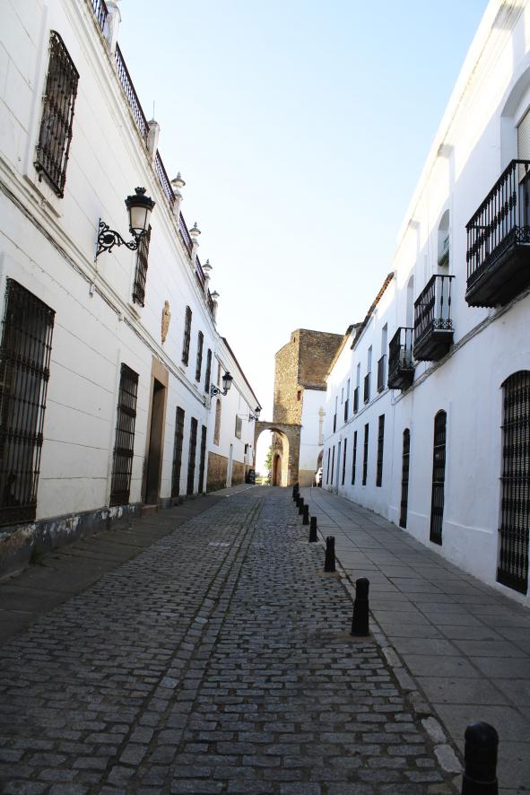 Calle con edificios blancos y arco al final, ZAFRA