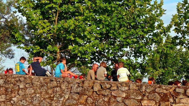 Sentados sobre la tapia,