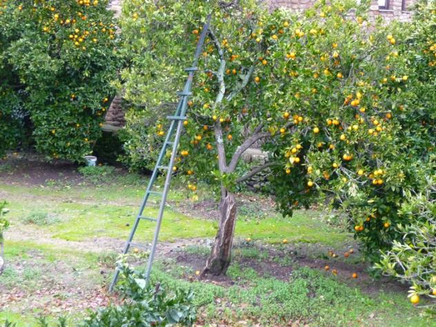 Escalera de mano sobre un naranjo,