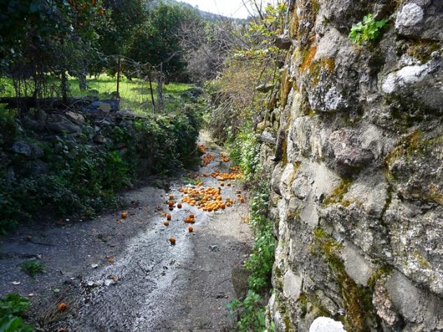 El agua arrastra las naranjas caidas,