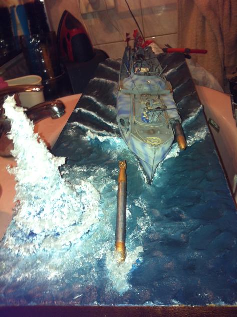 Luis eso es lo que se supone que esta haciendo lanzando los torpedos repeliendo un ataque, no se aprecia, Pero lleva 9 tripulantes en cubierta incluido capitán y todo en el puente de mando Pero si lo miras de esta manera parece que estubiera vivo y estubiera lanzando el Torpedo y si no Ganas nada de Nada a ti te quedara un BUEN SABOR DE BOCA.
