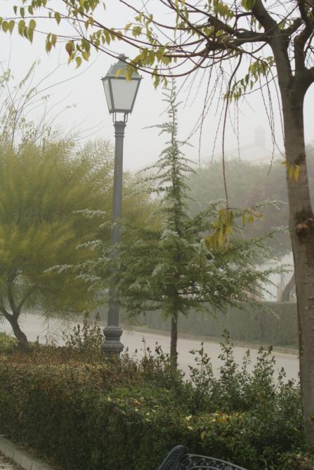 Paseo de Madroñera un día de niebla,