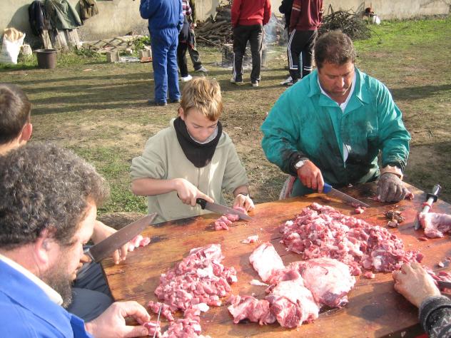 en mi casa el que mataba el cochino era el tio isidro, el roal, y lo mejor de todo era el aguardiente que tenian mis padres para tomar, que rico estaba. saludos para seve que este año en agosto me conocio despues de muchos años sin verme Hemos hablado, o más bien escrito sobre el carnaval, pero nadie ha comentado nada de la matanza del sábado, ¿que pasa que no fué nadie, ni se sacó ninguna foto? Aver seguro que Amigos del Patrimonio tiene algo que decir al respecto. Saludos cordiales. Ésta es una estampa entrañable, en la que vemos al maestro matarife PACO MATILLA enseñandole como se pica al niño JoséJOSÉ PEDRO BATALLA, que espabilo y sandunga no le falta. Es bueno y saludable para la sociedad estas enseñanzas para cuando llegue la natural renovación generacional. De la misma manera, nos alegró ver y comprobar el hábil manejo del hacha y su sapencia de saber qué es para una cosa y qué es `para la otra (buche, chorizo de huesos, etc) de LUIS "Prim"; por allí estaban sus padres...