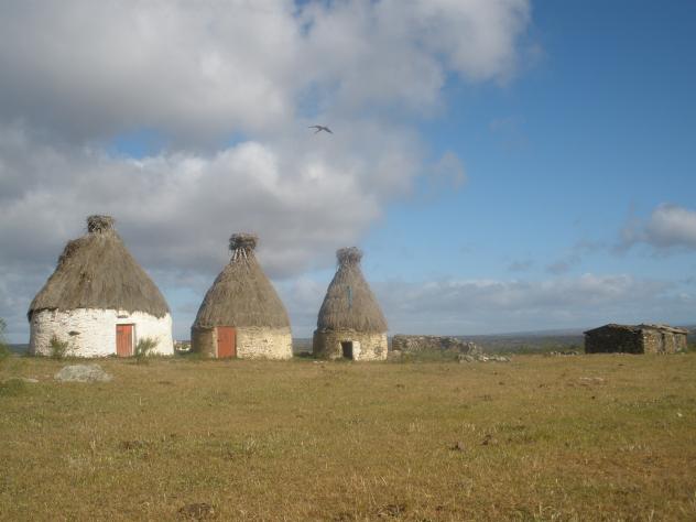 Los chozos y la vaquera: toda una plasmacion de la arquitectura pastoril tan típica de los campos de Membrío. En primer lugar, a la izquierda, el chozo grande, dormitorio; el segundo, el chozo para los serranos y, en ciertas épocas del año, para pienso; el tercero, el gallinero; el cuarto, derrumbado, el pajero, y, separado de ellos, la vaquera, para encerrar el ganado. Se han transformado significativamente porque antes el entramado interior era de palos de encina, curvados, que daban una imagen...