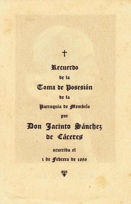 No habíamos ni nacido.... SALUDOS. Virgo, eras un buen niño, (ya te tenía yo entonces "puesta la etiqueta"). ¡Qué bien supiste guardar el recordatorio... Muy bien "VIRGO"... pues sigue ya con don Lope y don Gregorio. Es curioso, ambos se les recuerda más por "dar" escuela y ser administrador de Don Javier de Muguiro respectivamente. Pasando de largo de don Cándido y a don Aurelio capellanes de Zamores y Casillas también respectivamente, ¡ah...! y de nuestro actual párroco don Ángel, que por esas fechas se le nombró coadjutor en Valencia de Alcántara. Es meritoso conservar estos históricos recordatorios. Nosotros de este día de don Jacinto, recordamos...