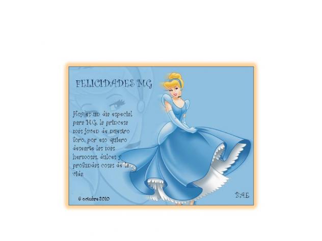 Buenos días amig@s, con esta bonita tarjeta (aunque sea del año pasado y un poquito tarde) quiero mandarle a MG mis mas sinceros deseos de felicidad, seguro que lo pasaste estupendamente.! MUCHAS FELICIDADES! sigues siendo la princesa mas joven de nuestro foro. Un beso