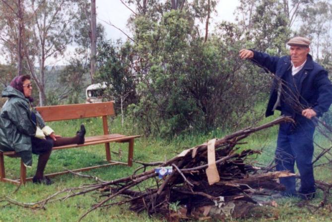 TEMA DEL DÍA. El ojo izquierdo. "PACO. J", nos está foto nos está recordando... o talvez diciéndonos que ante un accidente lo PRIMERO que hay que hacer -aparte de buscar seguridad- que no se enfrie el traumatizado. En este caso Emilia se produjo un esguince de tobillo, subiendo con la promesa de "HAZ DE ROMERO" a cuestas por esas barreras en la cercana desembocadura de la Rivera de Calatrucha, y Severiano... hace una hoguera para que no se enfríe... con el ánimo de axuxiliar. Con calor y sentada...
