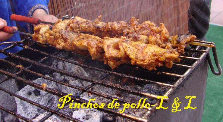 Pinchos: 1 Kg, de pollo, muslos deshuesados y cortados. 1 cucharada de pimentón dulce de la vera. 1 cucharadita de pimienta negra molida. 1 cucharadita de orégano.. 1 cucharada de hierbas provenzales. Sal a gusto. 5 dientes de ajos bien machacados en un mortero junto a los demás ingredientes bien mezclados para añadir a la carne....