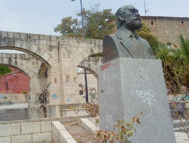 La escultura está dedicada al Doctor D. Marceliano Sayans. Medico de esta ciudad durante varias décadas, de de 1950 hasta finales de los años 90. Creo que fue delegado de patrimonio y poseía una buena coleción de piezas de todo tipo. Ahora estas estçan en el pueblo de Casas del Castañar.- Esta fotografía NO ES DE UN MARQUÉS, es de un célebre médico de esta ciudad