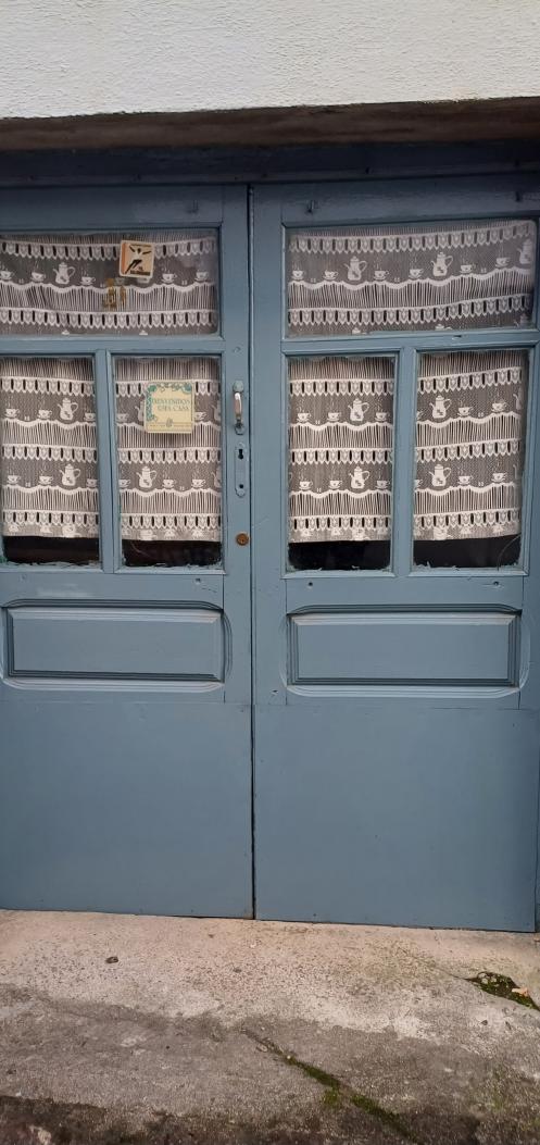 Visillos en una puerta de madera y cristal,