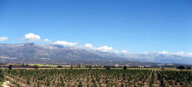 Desde el cruce de la carretera del Robleo y los pueblos nuevos . Al fondo , le sierre de Gredos .