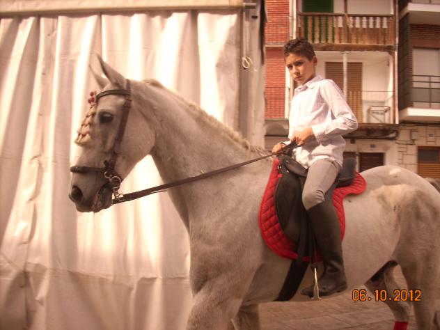 Un caballo tiene que ser como este: blanco, musculoso y esbelto, para ser elegante y de buen porte. Si te fijas el chico está tirando de las riendas, a lo que el caballo obedeció y se paró, y el chico posó para que le sacase la foto.