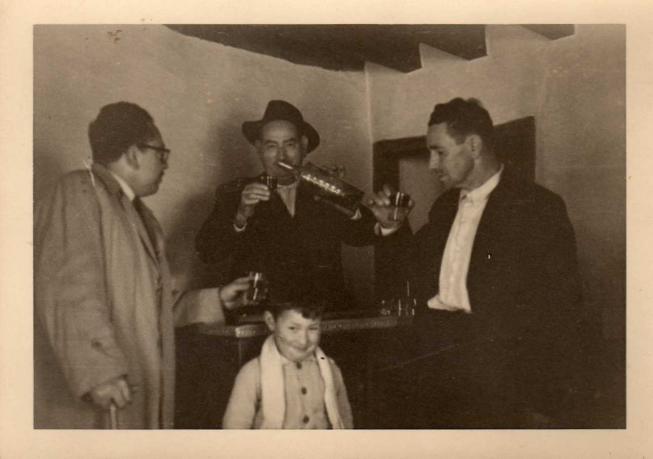 No acertaría con el año..... podría ser en los SESENTA Y PICO. En la taberna del tío Baena, el de la izquierda era un tío mio de apellido Morales, a la derecha seria el padre de Nono que se me escapa el nombre y el niño no puede ser otro que el mismo Nono.