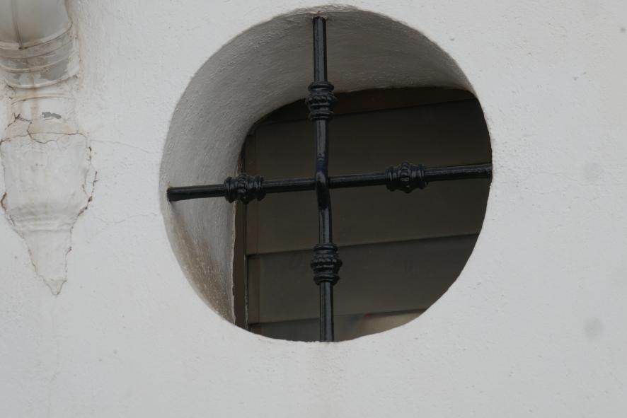 Ventana redonda con fuerte reja,