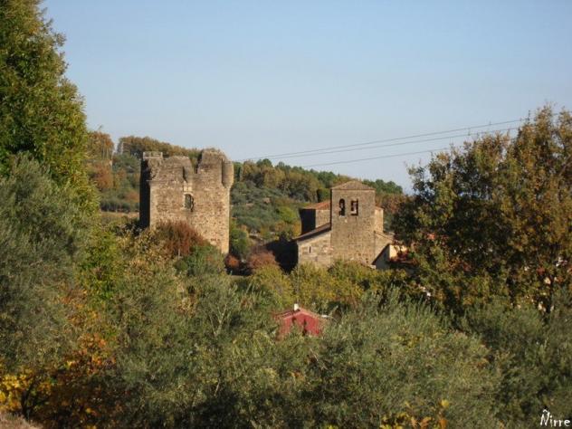 La iglesia y el castillo desde el camino rural,