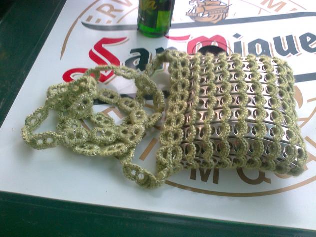 Bolso hecho por mujeres de villar con anillas abrelatas de coca cola, para ocupar el tiempo con actividades buenas, bonitas, baratas y útiles.