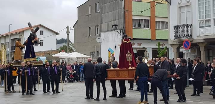 Escenificacíón del pasaje bíblico camino del Calvario, el Cirineo ayuda a Cristo a conducir la cruz, San Juan observa desde la distancia