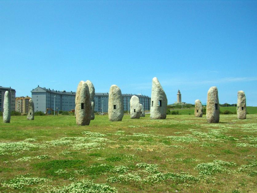 Menhires, obra de Manolo Paz, con la Torre de Hércules al fondo,