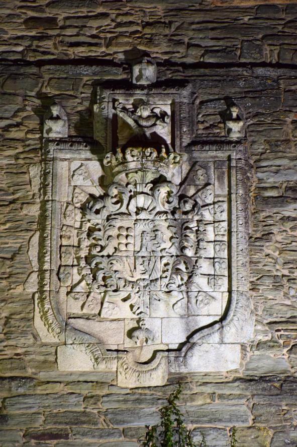 Magnífico escudo adornado con las 18 banderas ganadas a los franceses por Fernán Pérez de Andrade, en la Batalla de Seminara del año 1503, los seis roeles de los Catro de Lemos y la barra de los Andrade. Un ángel sostiene una inscripción Nolite Nocere (No hagáis daño). Este escudo fue trasladado desde la fachada del antiguo palacio.