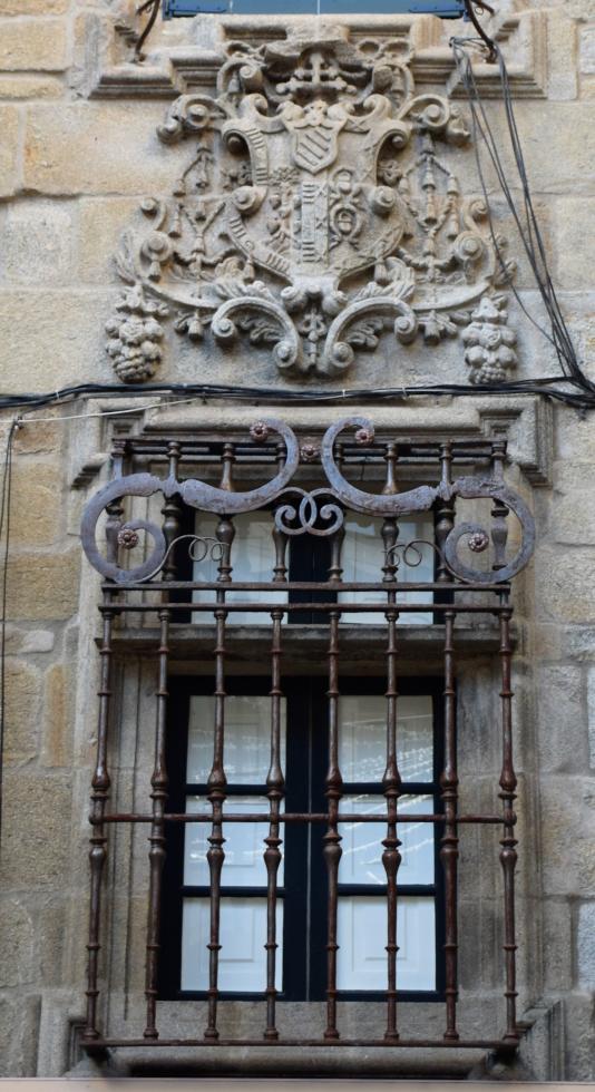 Escudo y ventana en una fachada de Plaza de Plateríías,