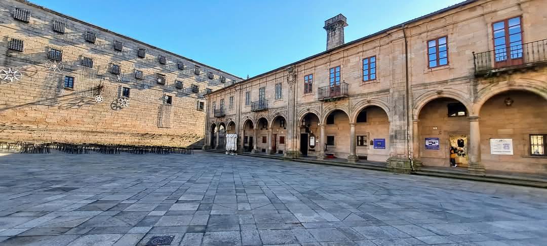 fachada del Monasterio de San Paio de Antealtares y soportales Casa da Congasa a Plaza Quintana,