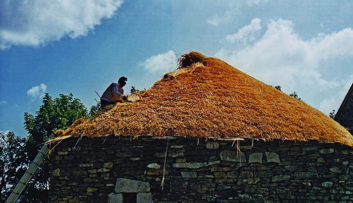 Reconstrucción del tejado de una palloza,