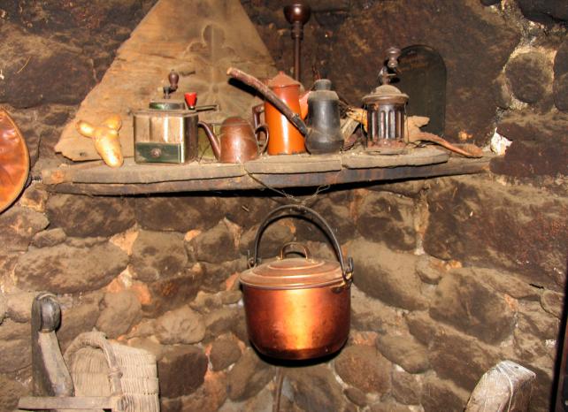Repisa con molinillos de café y teteras,