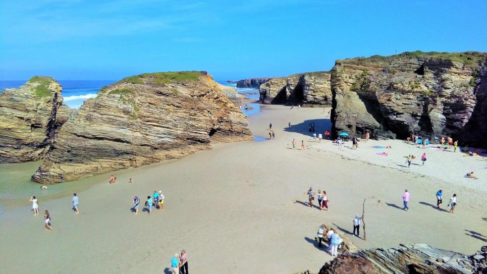 cuevas, sólo apreciables a pie de playa durante la bajamar. Durante la pleamar la playa es relativamente pequeña, de fina arena y sigue siendo adecuada para el baño. Es interesante ver la playa con la marea alta recorriendo la parte superior de los acantilados en dirección oeste-este hacia la playa de Esteiro y verla con marea baja sobre la arena de la playa.
