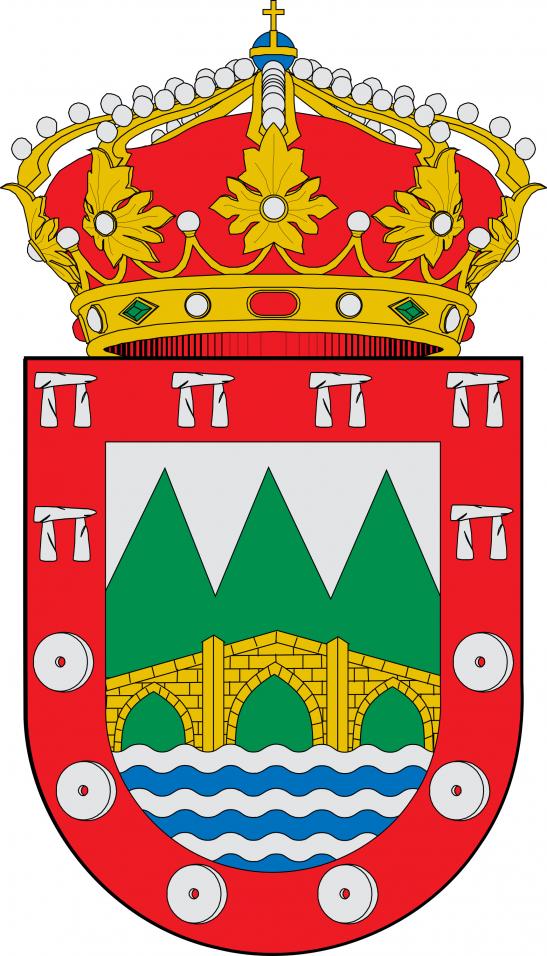 En campo de prata, en xefe encaixado de tres puntas altas de sinople cargado dunha ponte de ouro a dúas augas, sobre ondas de prata e azur; bordo de gules cargado de seis dolmens de prata en xefe e seis rodas de muíño de prata en punta. Ao timbre a coroa real pechada.