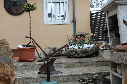 fregadera con flores en abril y nevando,