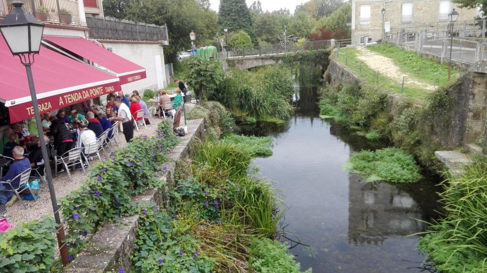 Después de pasar parte de la mañana recibiendo tratamiento o haciendo el circuito termal y nadando en la piscina al exterior, los bañistas se dirigen a la terraza de la orilla del río a cargar nuevamente las baterías. Un buen vino Albariño, un pulpo a feira y algo de empanada gallega restablecen las energías gastadas en el ejercicio matutino. Si, además el sol y buen tiempo de otoño acompaña, el mejor sitio es la terraza junto al agua como se ve en la imagen.