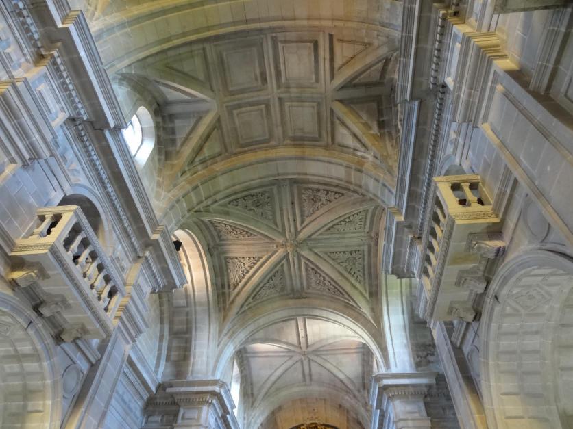 Durante su largo proceso de construcción, no se llevaron a cabo los planos originales, adquiriendo elementos barrocos, así la techumbre se estaba tallando en 1706 siglo XVIII.