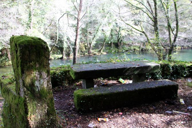 Mesa y banco de piedra a orillas del rio Verdugo,