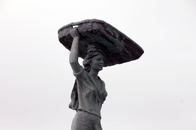 Pescantina con cesta de pescado en la cabeza,