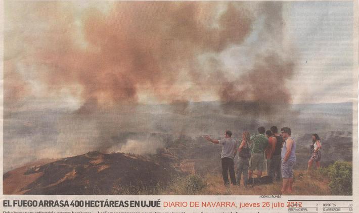 Información del grave incendio que se destó en Uxue el 25 de julio de 2012, arrasando el pinar del alto El Guarro. Pincha en la dirección siguiente. Volvemos a insistir que la información es errónea, no fueron 400 hectáreas, mas bien fueron 237. Ver medios de comunicación a posteriori. Foto tomada de la primera página del Diario de Cordovilla.