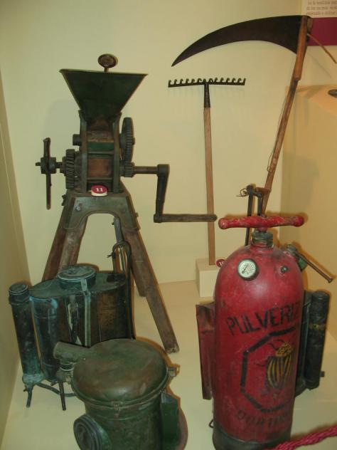 Que foto mas completa, y que variedad de cosas se pueden hacer con los distintos artilugios, tenemos la solfatiadora que sirve para líquidos como el sulfato de las viñas y para pintar paredes, lo digo por que lo he visto yo, La redonda esa sirve para echar producto en seco como azufre o algo parecido, esa pulverizador rojo eso es para echar veneno a las patatas o algo que haya que pulverizar, luego tenemos la guadaña que esa sirve para segar los distintos cereales y además la alfalfa, Arvejana y...