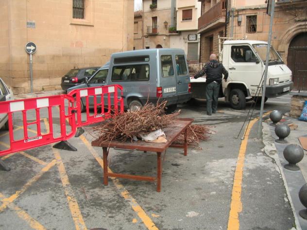 Ahí tenemos uno de los que han estado preparando la degustación, acercándose a la furgoneta del Ayuntamiento para ir preparando la lumbre, digo para preparar la lumbre pero aun faltaba un buen rato para tales menesteres, por que solo eran las 11 de la mañana y no penséis que a esa hora han empezado a preparar la degustación, allí tenían la furgoneta llena de leña para ir cogiendo en su momento como estamos viendo, un buen montón de sarmientos para encender y la leña para hacer el rescoldo que asaría...