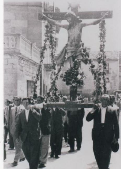 Amigos ya he dicho antes, que gracias a Manolo Gonzalez no quedara ningún comentario incompleto, por ejemplo en el comentario que tiene esta foto ponía que no sabia el por que en Mayo sacaron al Cristo crucificado en procesión, pues según la información de Manolo aquel año era un año con una sequía tremenda, y sacaron al Cristo en procesión para hacer una rogativa para que se arreglaría el tiempo y por la intercesión del Cristo crucificado llovería para que los campos se pondrían frondosos y florecientes... Que adornado llevan a nuestro señor, sobre las andas por la plaza mayor que no se si serán las mismas que tiene ahora para sacarle en procesión en semana santa, Yo pensé que el Cristo lo sacaban solamente en semana Santa pero veo que no, por que esta foto esta sacada el día 17 de Mayo de 1944, y después de comprobarlo veo que ese día no hay ninguna fiesta que sea como para hacer una procesión con el Cristo crucificado, pero amigos ellos sabrían el por que hacían esta procesión, y de las personas...
