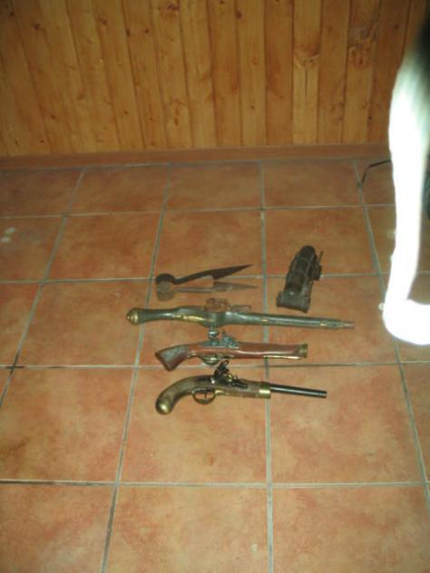 Que antiguedad hay es estos artilugios, seguro que cada uno de ellos tendrán su historia, alguno de ellos la historia de algún duelo o muerte en alguna pelea como en el Oeste, o en esas historias que hemos visto en la television allí en la serranía,, en ella podemos ver 2 revólveres y un trabuco que si no me equivoco es de bancarga de esas que llevaba Curro Jimenez en aquella seria de television que nos gustaba tanto, pero amigos también hay unas tijeras de esquilar de hace bastantes años esa es...