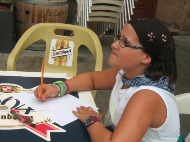 Esta niña es una participante del concurso de dibujo, que se hizo en la Plaza mayor el día 25 Sábado fiestas de nuestro pueblo, la estuve observando y la veía con una facilidad pasmosa, una facilidad para coger los lapiceros que daba gusto verla dibujar, en la fotografía estaba dibujando la torre de nuestro pueblo y le estaba quedando de maravilla, y según me dijeron es una niña que se le da muy bien pintar una niña que asistió no se si ahora esta también yendo a un curso de pintura, a la asociación...