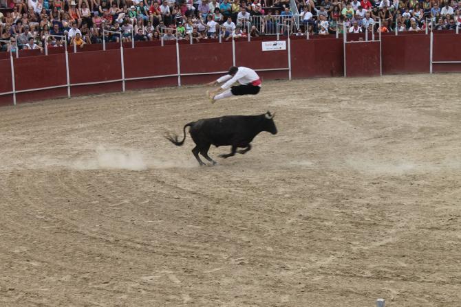 Que habilidad y destreza nos demuestra este joven, mientras la gente espectante no pierde ni un segundo en quitar la vista de la acción del que brinca por encima de la vaca, yo creo que tiene que hacer falta una gimnasia fuera de lo normal por que para eso tiene que hacer falta en el cuerpo humano una flexivilidad tremenda, flexivilidad y entrenamiento, y luego una cosa muy importante no tener miedo por que seguro que si tendrían miedo seria imposible hacer esos ejercicios sin tener algún percance,...