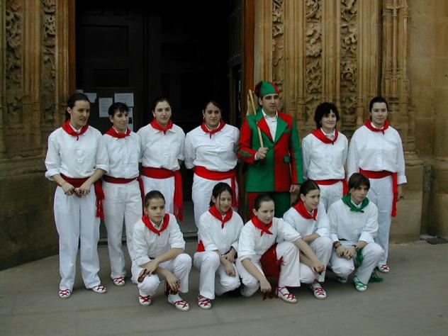 Dentro de pocos días veremos con ilusión una estampa como esta, unos danzarines que en el día de los Patronos bailaran la danza en su honor, seguro que estarán deseando que llegue ese día para honrrar a nuestros patronos con la danza, los danzarines irán bailando por las calles en que transcurre la procesión delante de los patronos, y sin darles la espalda frente a ellos y bailando para atrás, no se merecen que se les de la espalda por que son los amigos y benefactores que tenemos, los que durante... Amigos tiene que ser un honor bailar la danza de los Patronos, y por lo que veo estas chicas la han bailado en esta ocasión, prueba de ello que están con Juan José el Catxi en la puerta de la iglesia, yo personal mente no lo he visto nunca pero viendo que son los once danzadores y el de los atuendos verdes que es el que corre por entre ellos mientras ejecutan esta maravillosa danza que tenemos en Oyon, no me cabe ninguna duda de que ellas también tienen esa suerte no van a ser siempre los hombres,...